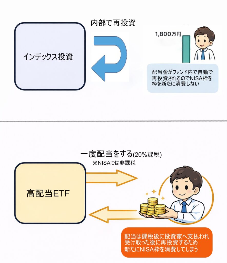 分配型であれば、一度受け取ってから再投資するため、NISA枠を新たに消費します。